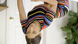 Super-cute Violet Rain seduces dude in the hostel and gets bald pussy stretched