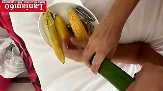 Sexy girl thrusts banana and grapes in her hot pussy