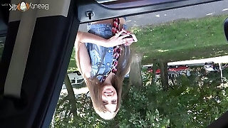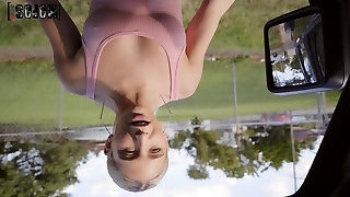 Blonde Katy Rose ridding a long stranger's wood in the van