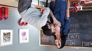 Brunette hottie with great tits pummels and sucks her schoolteacher in the classroom