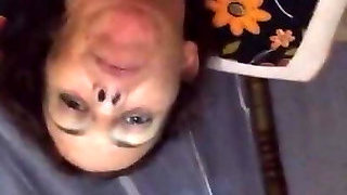 ugly shaved head female blowing her man
