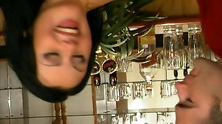 Arched over the counter huge-boobed sexpot Becky Bandini gets poked well