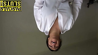 Plus-size slave girl gets her tits tied. Predicament bondage with an anal hook.