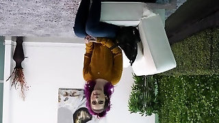 Purple haired slut Scarlett wraps her lips around a long pillar