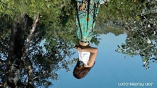 Erotic nude solo girl outdoors has a flawless shaved pussy