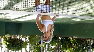 Light-haired tennis hottie strips on the court and flaunts her labia